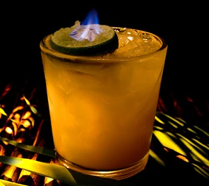 Dry shake all ingredients and strain into a chilled double rocks glass. Add crushed ice until it reaches the rim of the glass. Invert the spent lime shell so that the peel faces in, and pour green Chartreuse into shell. Set Chartreuse ablaze with a match, and serve. Let burn for 30 seconds to warm the oils in the lime skin, then blow out and tip into the drink.