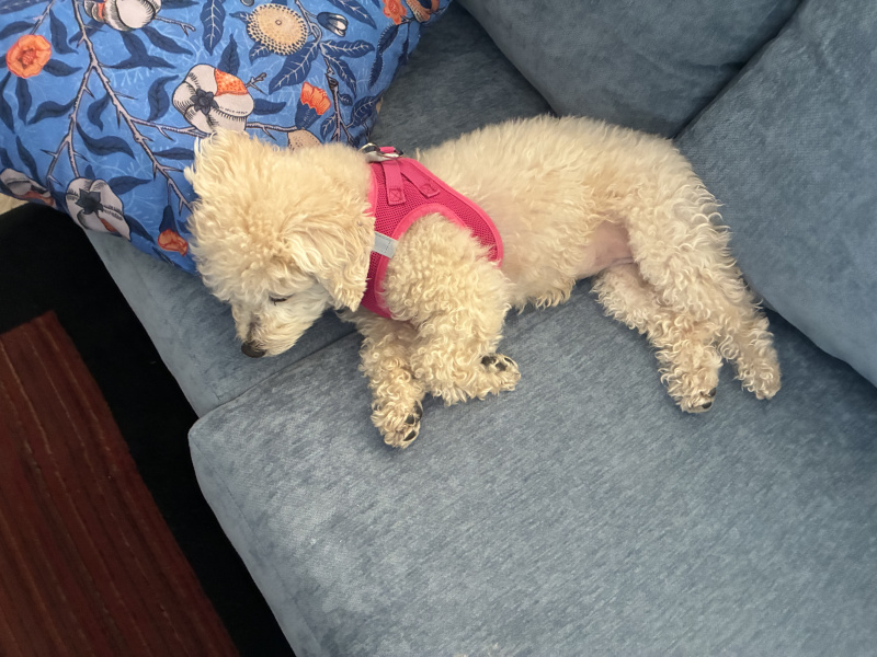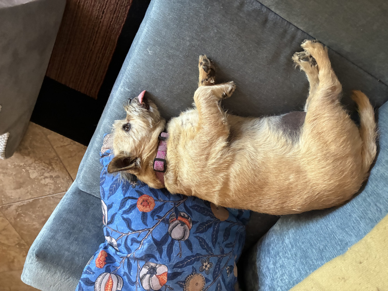 Looks like we have a long term guest. Belle in first pic and Mutz in second. They have camped out on separate couches and are doing fine together for two dogs who both think he/she is Royal of the household.