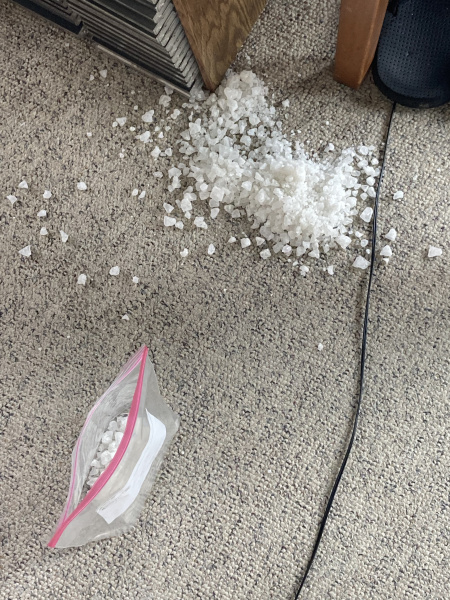 I was going along good for about 7 windows. On the one sill I had a bag of sea salt from a Puerto Rico salt flat, and it sat in a metal decorative leaf. I went to pick up the bag on its own, and the bag disintegrated in my hand. The sun does that. Salt poured onto the floor. I picked up what I could and vacuumed up the rest. It’s another - no good deed goes unpunished.