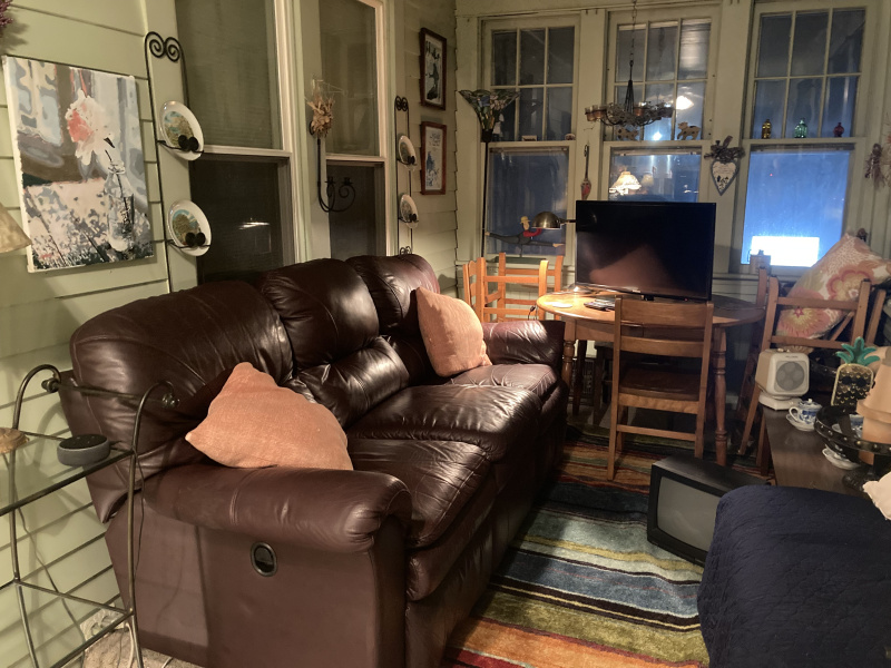 New sofa - ignore the junk on my end table.Sofa now on the front porch. Ignore the way TOO much stuff out there.