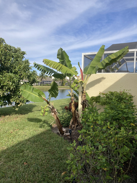 Banana trees needed trimming - many leaves removed from each of them. And the big purple flowers removed from the 2 trees with bananas growing. So much overgrowth.