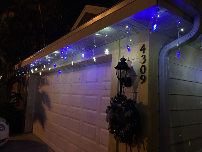 On the back lanai I draped lighted garland over the hurricane shutters. Everything is on timers except a set of 5 large (6”) snowflakes- blue & white, with 8 different choices for lighting - they’re inside the house, on the kitchen window.