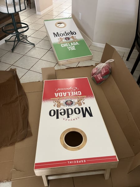 I puttered in the garage, out of the rain. We brought in the heavy box with the corn hole game. And to my great surprise, it didn’t need to be put together! The legs folded out, and we can store it flat against the garage wall.