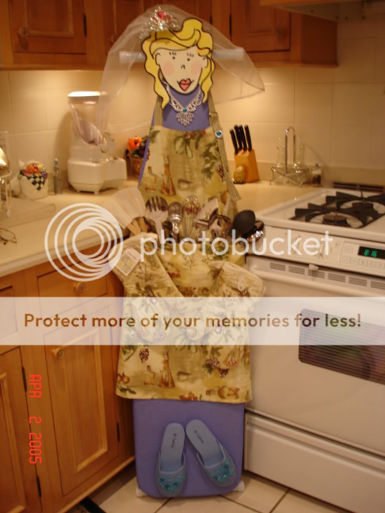 Okiegal, I think it will be fun to throw the shower! When my nephew got married a while ago I made this (picture below) for fun. It's an iron board dressed with a full apron. The pockets are filled with kitchen utensils and matching oven mits for hands.  I purchased the veil and costume jewelry at the party store! LOL!  The future bride wore the veil while she opened her gifts! It was fun!