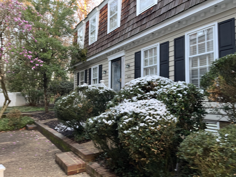 Here is a picture of what we have been like lately…in one day, 70's and trees blooming, then a 40 degree drop in temps with lightening storm, hail and snow. Tulip poplar blooming in left background and snow on the bushes in the courtyard in front of our home: