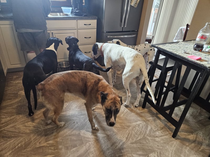 Dog walking & other dog stuff all day. They are all now peacefully chewing on frozen bones while DH & I watch the high school boys state basketball tournament. Here they are helping DH with the dishes!