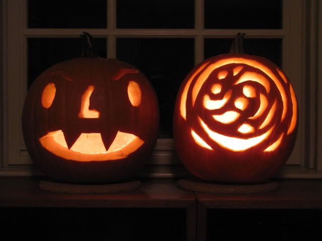 NatsFan, glad you are hunkered down. That's one spooky story! I don't have one to offer, but I will contribute pics of the pumpkins my husband and I carved last night. His is the scary one. Mine is just a mandala, although it glows nicely.