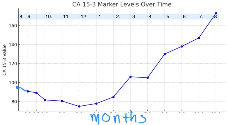 @tbos805 So, my oncologist was not concerned about the tumor marker movement at all. (I am tested for CA-15.3). I have a PET scan at the end of the month, so we'll see what activity is happening then. Let's hope nothing.
