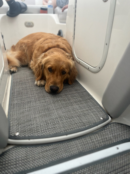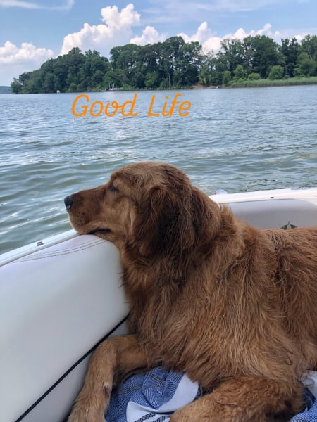 DH and I went boating today and the weather was nice. Humidity has left for now and there was a breeze to keep us cool. Buster came along and played with 4 other retrievers on the beach. He is living his best rescue dog life!