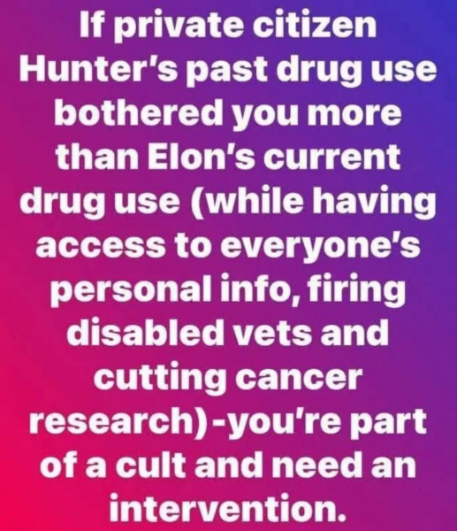 As they all seem a mite over the top mentally deficit, they don't seem to be scoring quite as they had hoped. As we have never faced this before it is hard to judge where they see themselves but Musk and Loon have generated more firings and lawsuits ( many of which have and still continue to go against them) than anything else. So I don't lose hope along the way to the mountains of 24 hour news I was at one time consuming. Better for me to continue to back off.
