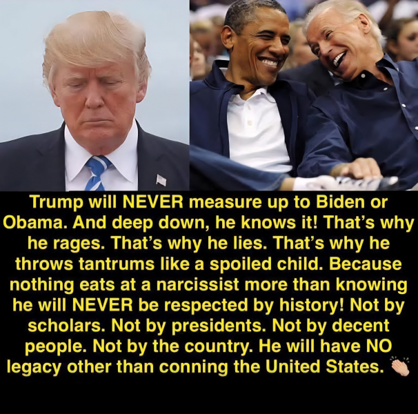 This to me is so very true. It is hard to imagine that the loon gets so little from life. When you see people like Obama and Biden just enjoying BEING and sharing something obviously very amusing — and then knowing that for all the Loon would seem to have — it is not possible for him to have a good laugh — likely enjoy a sunrise or a night sky full of stars. He has a nothing sort of life likely without even memories of wonderful soul refreshing times shared with loved ones and friends. The emptiest soul in the world sits in the White House thinking only of himself.