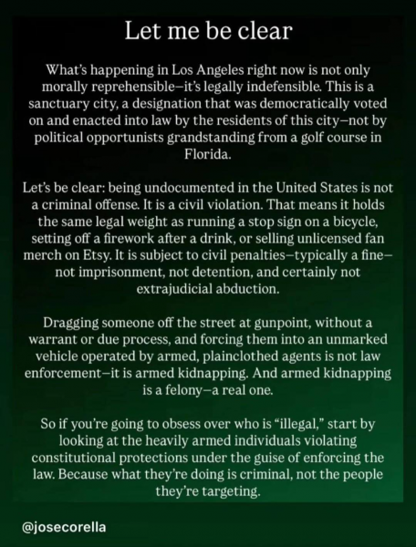 Read on the way here —- the Marines that have been deployed to L.A. are not happy, and are pretty un-settled about a mission like what they have been seemingly saddled with. Good for them if they recognize that they are being used (illegally).