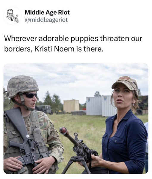 The agents raided the house as Noem stood outside in her bulletproof vest, cosplaying as a tough soldier in full glam makeup. Unable to find their target, she and the agents eventually departed.