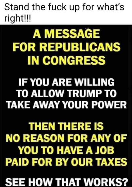 Not a damn person on his side standing up to put on the brakes. Every a-hole in the world is residing in the Reps. party right now.