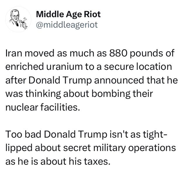 In other words, we simply do not know the state of Iran’s nuclear program right now. As usual, Donald Trump doesn’t care about the facts. He lives in a reality of his own making and projects that out to his MAGA base, who in turn eagerly gobble it up. Only time will tell the truth of the matter.
