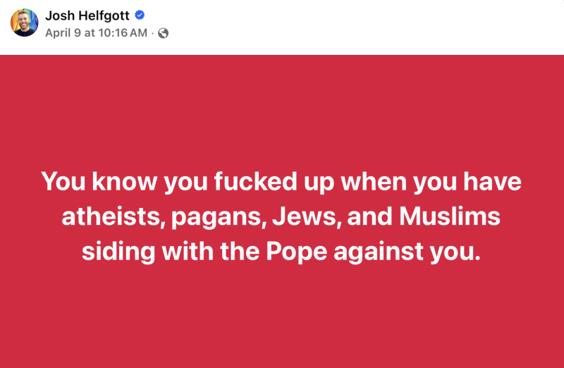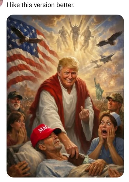 I am not Catholic or generally religious, but I say hurray for the Pope, one of the few world leaders who are speaking out against the horror and suffering of so many people perpetrated by Trump and Netanyahu! Our own Canadian Prime Minister is very tepid about it all, saying he approves of a "Zionist Palestine" whatever that is. The Pope is no doubt cognizant of the Reich Concordat of 1933 when Hitler convinced the Pope and the Catholic Church not to oppose his actions, or else they would be his next target. They acquiesced and it's been a stain on the church ever since. Trump's latest graphic of himself as Jesus Christ is further evidence of his defective mental state and delusions of grandeur. Hopefully lots of American voters are offended. To paraphrase what George Clooney said recently: I agree with with the President that we should make America great again, starting in November.