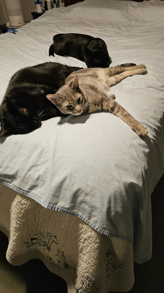 The girls are doing great. I recently inearthed Grace's cat bed from a box since she was using one of my throw blankets as a bed in my recliner. Was worried shecwouldn't use it as I put it in my recliner one time to plug something in and I turned around and there she was all happy and curled up. So now at night i put the bed on my recliner and take one of my throws and drape it over and leave an opening so she has a cozy cave to sleep in. Princess just started to sleep on her daddy's blankets and let me cover her when I go to bed. She never used to let me do that.