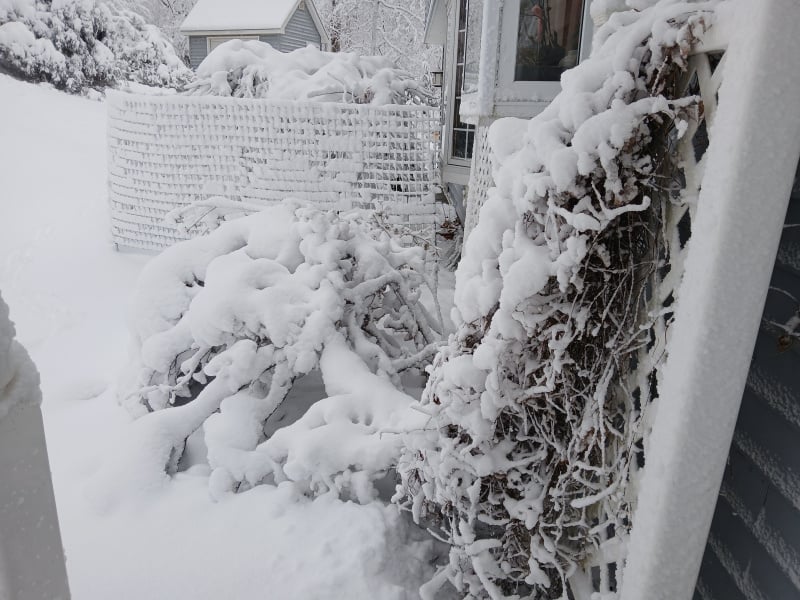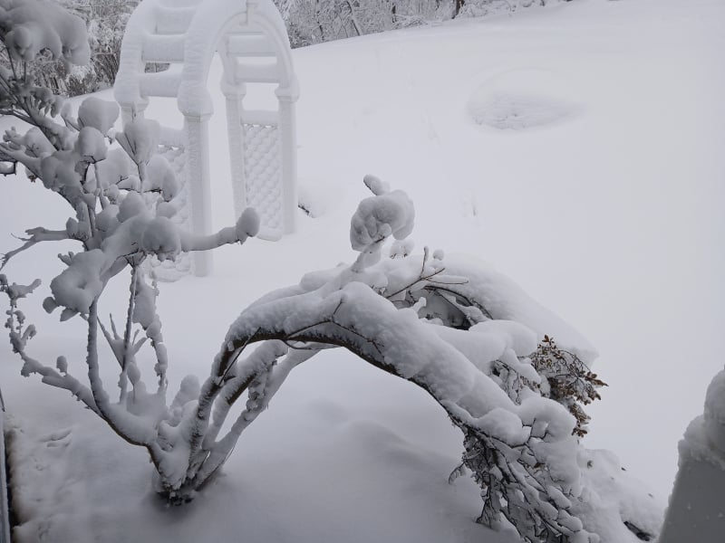 Under the lump in this last photo is an azalea bent to the ground like the one in the first photo. It continues to snow but not as heavy as yesterday.