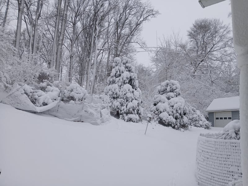 It's early because I could not go back to sleep. It is a winter wonderland out there and while beautiful, very destructive. The snow is very heavy and has managed to bend my tall azaleas, on the back of the house, nearly to the ground. They will bounce back, but you are cautioned not to attempt to remove the snow, they will shed it eventually and then stand tall again.