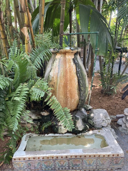 This is a cat drinking fountain. Ernest brought the base home from Sloppy Joe’s when it moved - it’s actually from a urinal. His wife undaunted, had it surrounded in tiles and added the large urn.